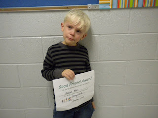 Madden won an award at school for the 1st nine weeks and his 1st grade team has a little program to celebrate. He won the Good Friend Award. He was so excited!